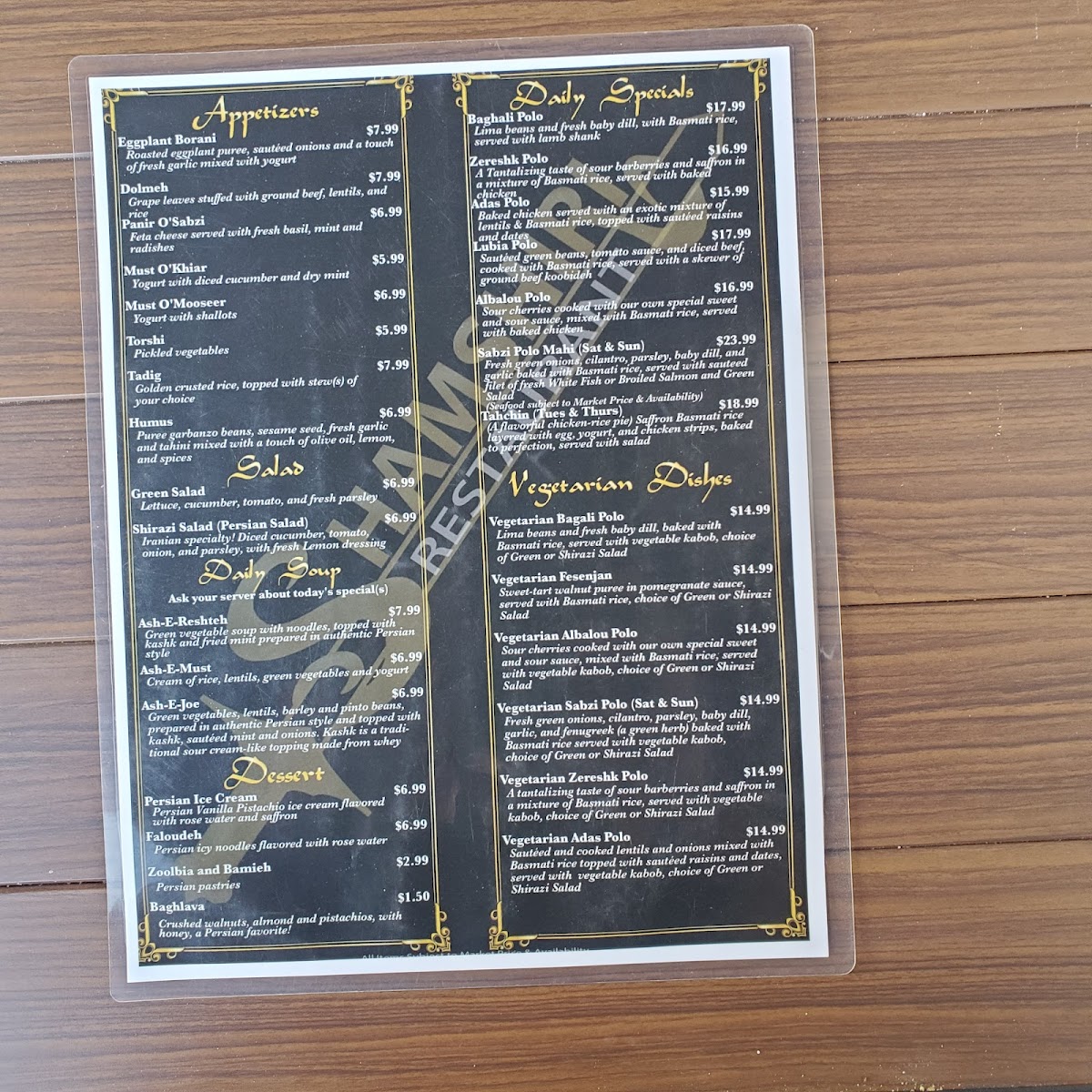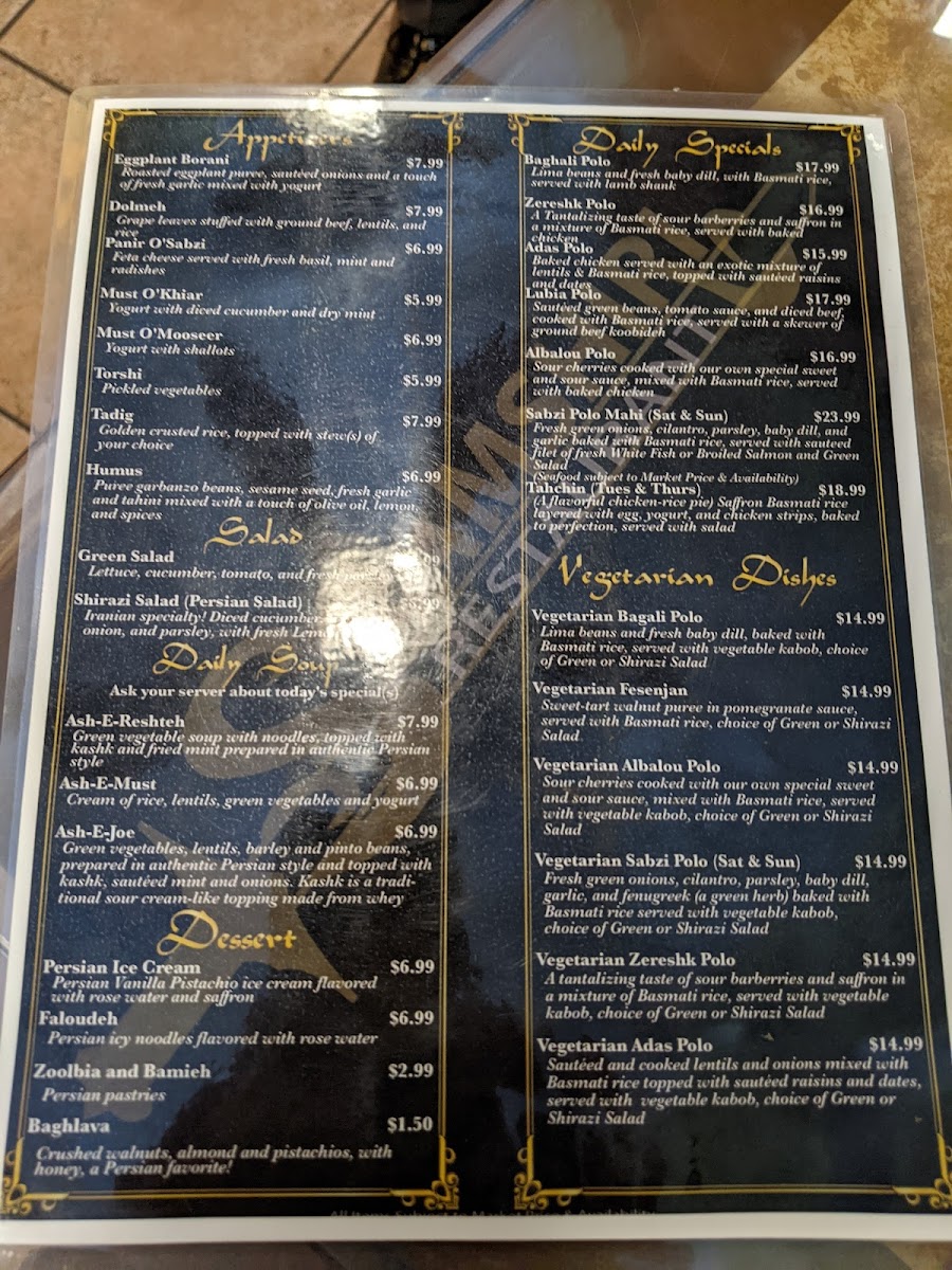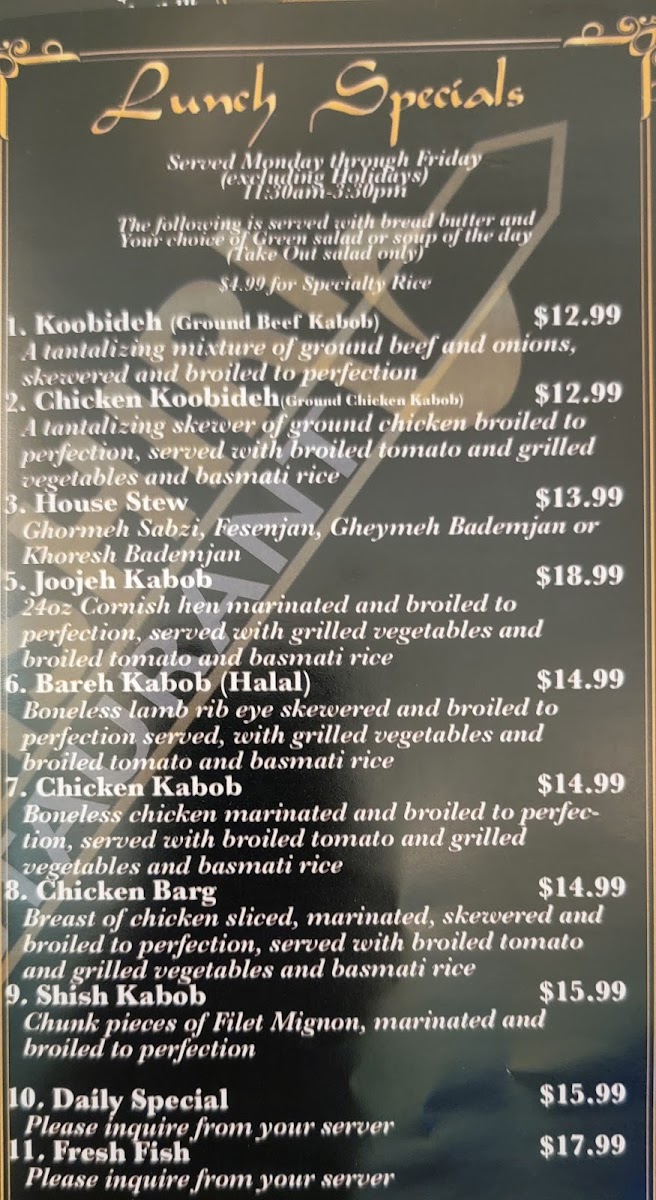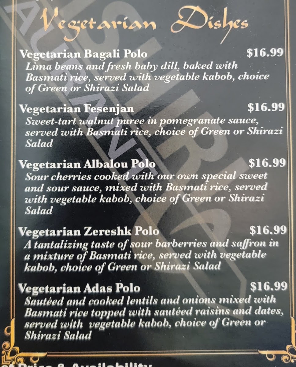A tantalizing taste of sour barberries and saffron in a mixture of basmati rice, served with vegetable kabob, choice of green or shirazi salad.