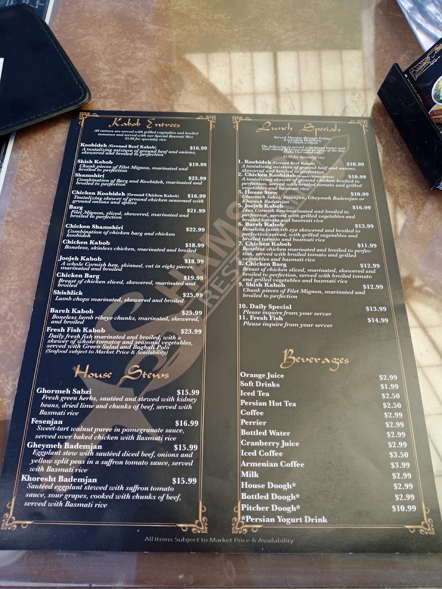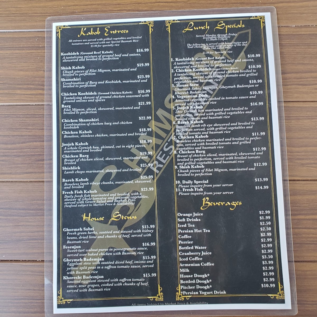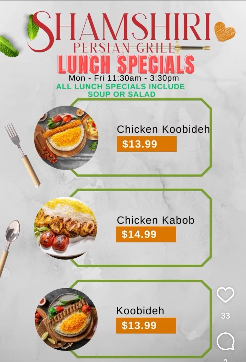 A tantalizing taste of sour barberries and saffron in a mixture of basmati rice, served with vegetable kabob, choice of green or shirazi salad.
