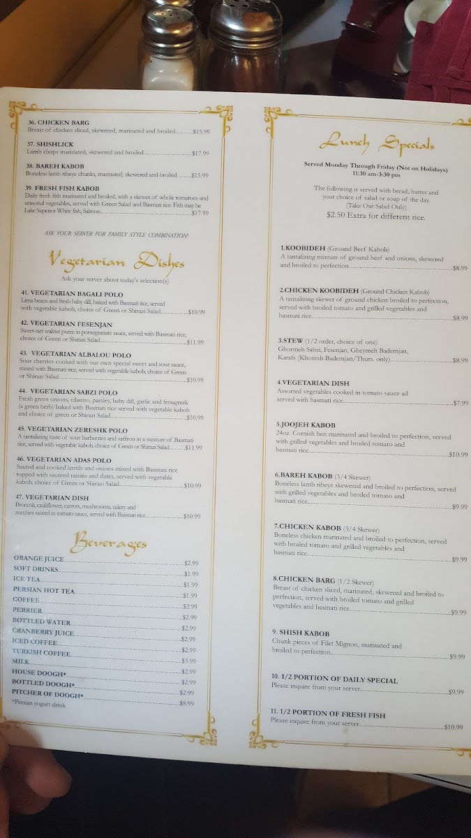 Sour cherries cooked with our own special sweet and sour sauce, mixed with basmati rice, served with vegetable kabob, choice of green or shirazi salad.