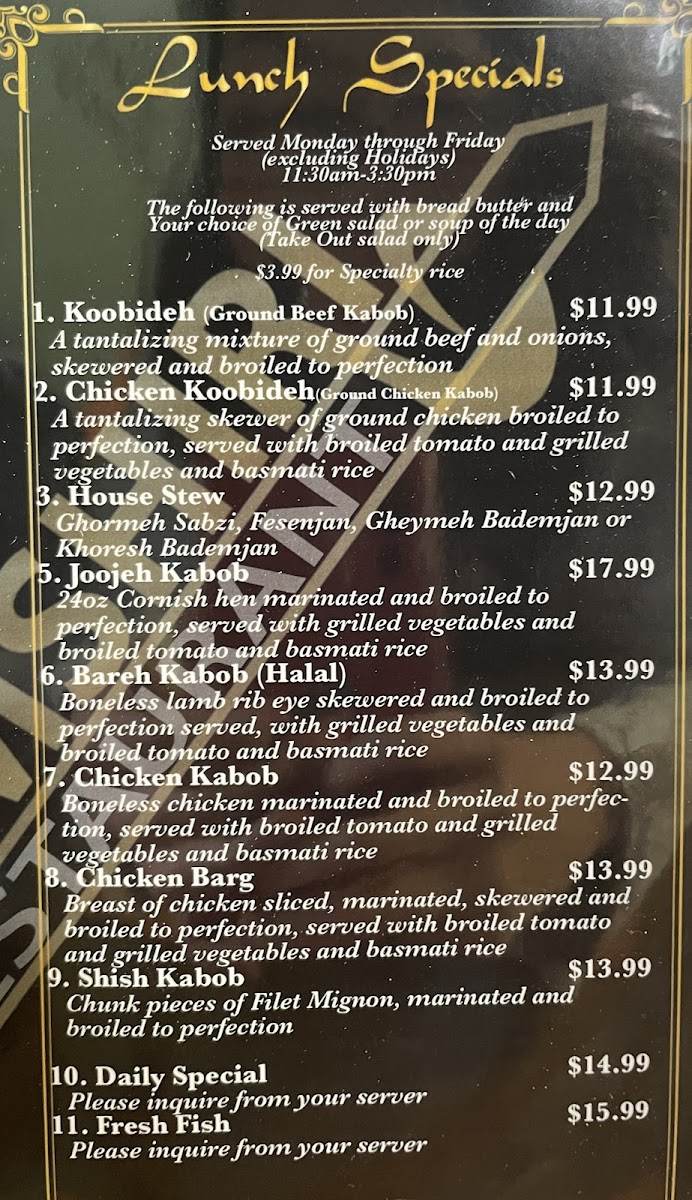 Sautéed and cooked lentils and onions mixed with basmati rice topped with sautéed raisins and dates, served with vegetable kabob, choice of green or shirazi salad.