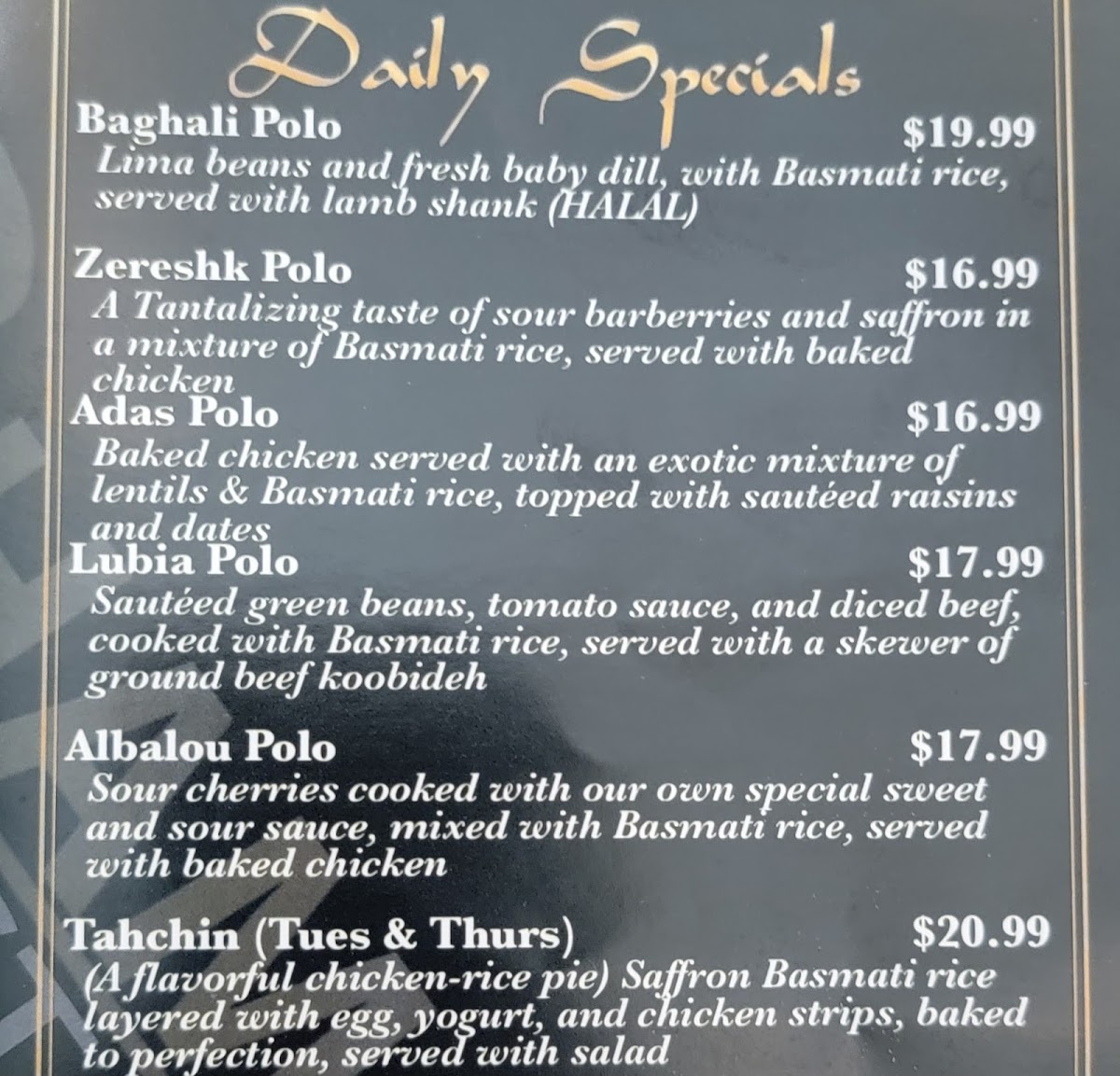 Soup of the day varies daily from Ash Reshte, Ash Must and Ash Joe.